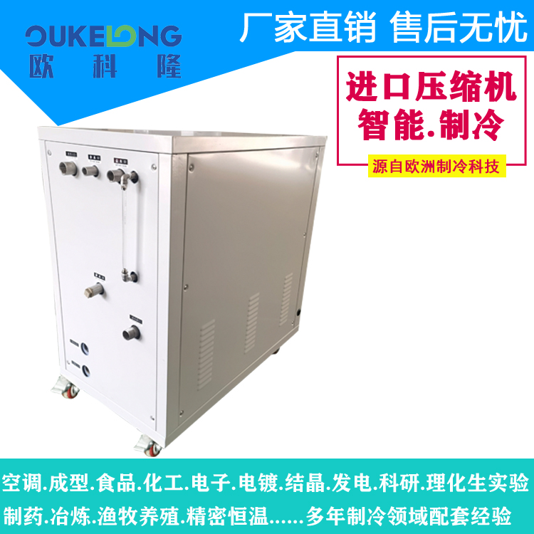欧科隆制冷水冷箱式冷水机组详细特点介绍.制冷心脏采用全密封低噪音,振动小,采用高效能省电国际著名名牌压缩机(美国谷轮牌,日本三洋,日本大金,法国美优乐等),电器控制全部采用进口名牌原件,热交换器采用壳管式冷凝器,换热效能高,便于清洗保养。