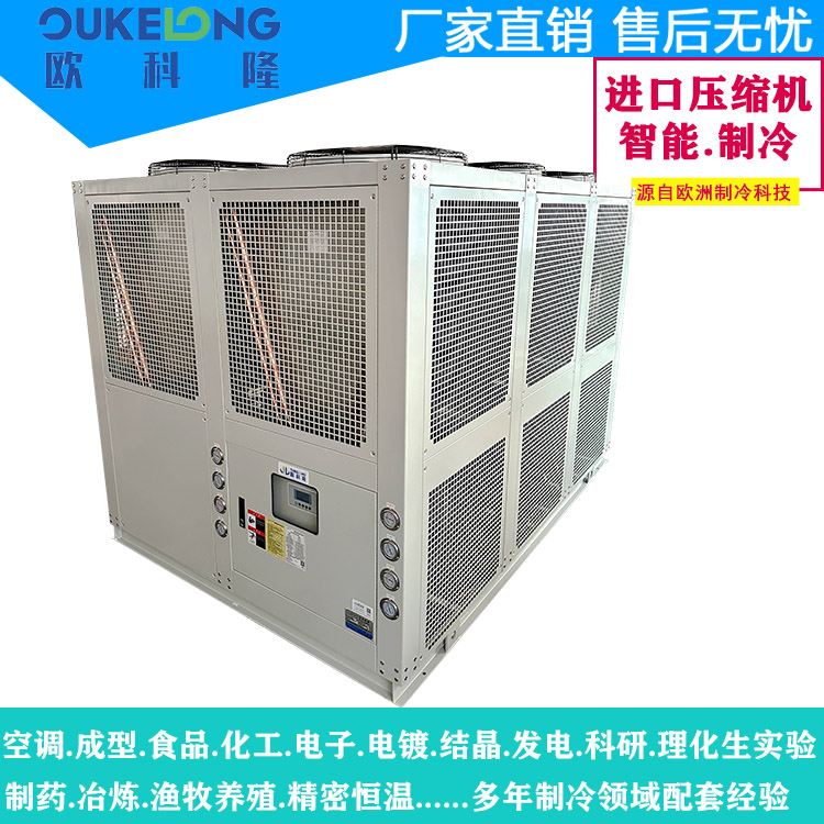 欧科隆制冷80HP风冷箱式冷水机是一款大功率工业制冷设备,专为重型制造和连续生产场景设计。该机型采用一体化箱式结构,集成高效风冷散热系统,突破性实现80匹(约240kW)制冷量,无需外接冷却塔即可满足超大规模冷却需求,是能源、化工、冶金等行业的理想选择。
